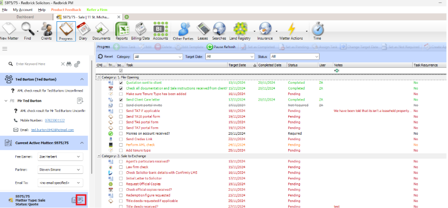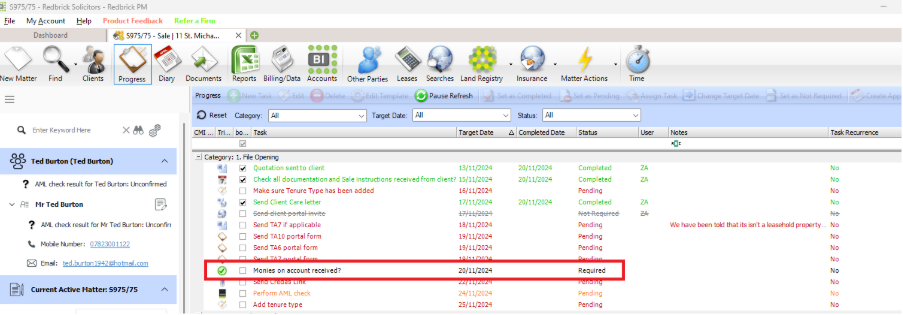 You can activate a matter by ticking off a task in the Progress screen that has the Activate trigger set against it. The symbols that indicate which task triggers will be fired are typically to the left of the task and the Change Status trigger (such as to change to Active, in this example) is a green circle with a tick in it.