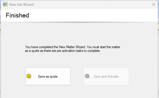 At the point of creation of a matter, click Save and Activate. However, this option may have been disabled by your Administrator. If the Save and Activate button is greyed out you must open your matter in Quote status first so that you can progress through the quote level work required.