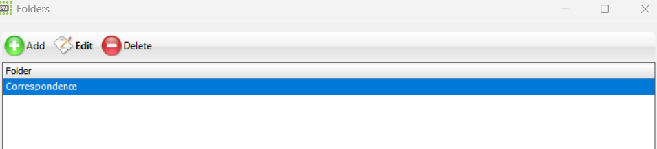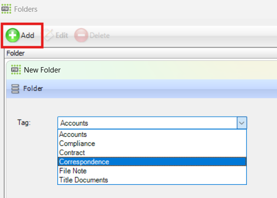 This will then bring up the folder window. Click on the green +Add button and use the tag textbox drop down to select the folder you want the document to be assigned to and click OK.