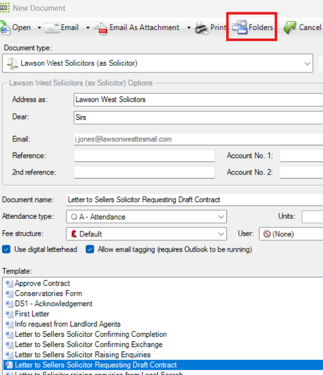 You can add the document to additional folders by clicking on the green + button and repeating the above process. When you have selected the folder(s), close the folder window and continue to generate the document or email in the usual way. They will then save within the selected folder(s) in the document screen of the matter.