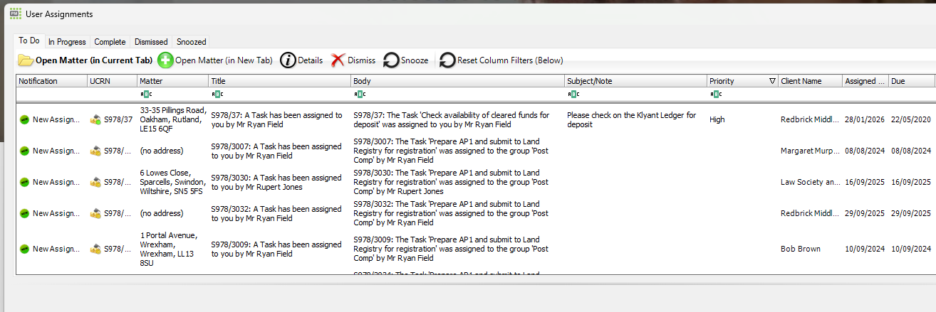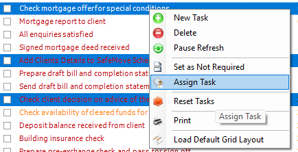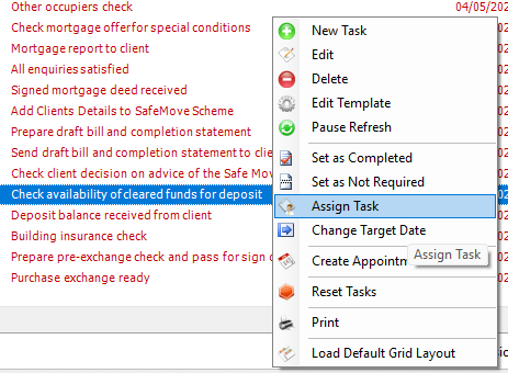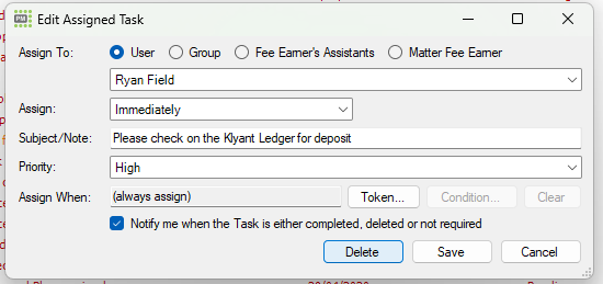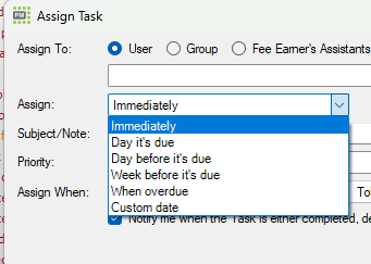 If assigning a task from a task template do not select "Immediately", if you do the task will be assigned as soon as the matter is created. This often leads to confusion if you are assigning tasks later in the process (such as post completion/settlement tasks)