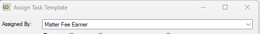 The only difference to the pop up shown below is that in the task template set up, you also have the ability to choose who its been assigned by (the default is the matter fee earner, but some firms will set up a fake user called "Task Assigner" or similar to show its an automated process
