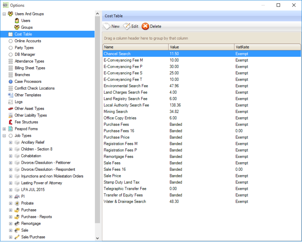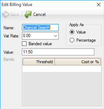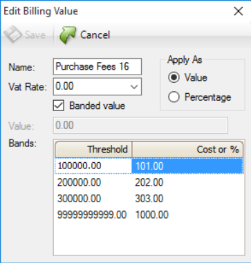 You can also select whether the value that gets pulled to the billing screen is a Value or a Percentage. A value is a precise figure (for example, when the value of the property as entered into the Contract Price field in the Property Details panel) is over £600,000, fees can be set to £600.00). Percentage will calculate whatever percentage level you set as against the Contract price. For example, if a threshold of over £600,000 is set to a percentage of 0.25 then the fee will calculate out at £1,500, being 0.25 percent of 600,000.