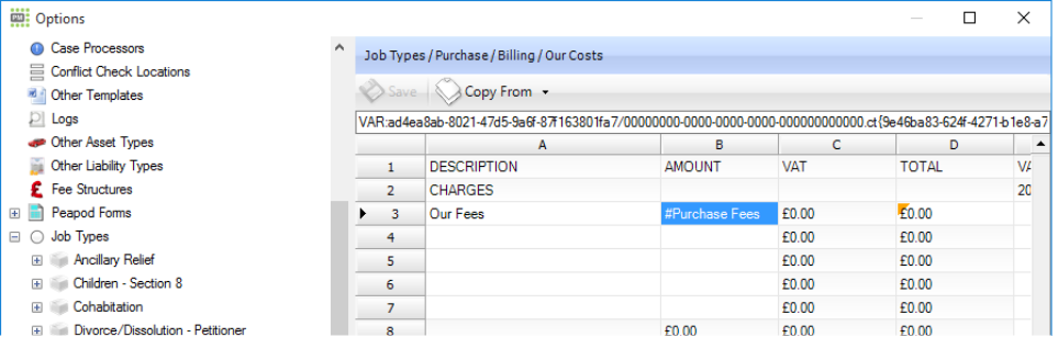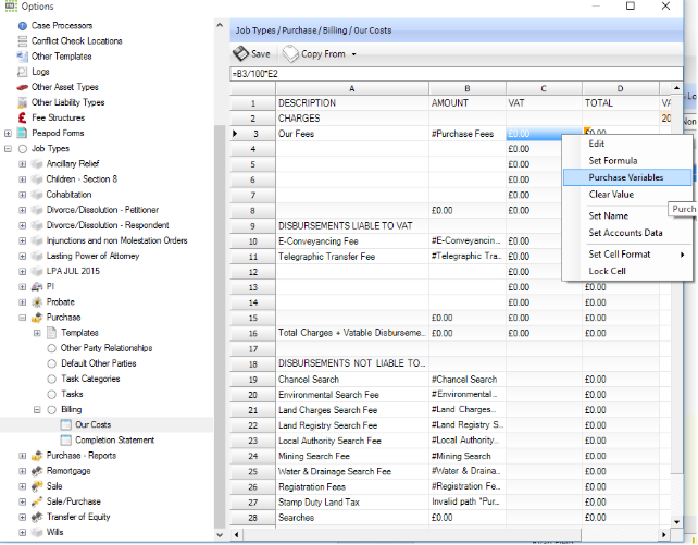 On the billing screen, right click on the cell you would like to pull a value into and select the Job Type Variables (the example below is in a Purchase Job Type)