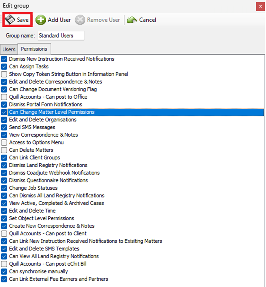 the rights of the group on the second tab (Permissions). Tick accordingly then