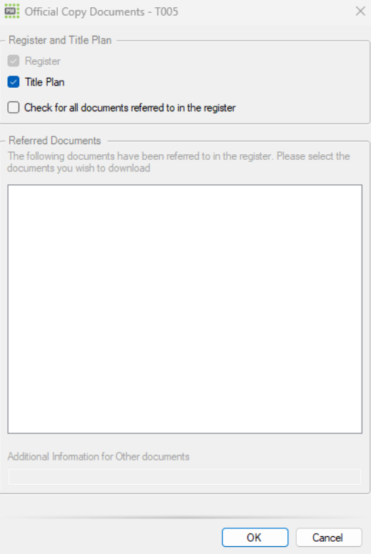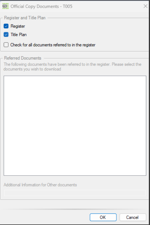 Once selected, the same window as described above will open. At this stage, you can tick or untick the option to include a copy of the Title Plan and, if required, tick the option to check for all documents referred to in the register.