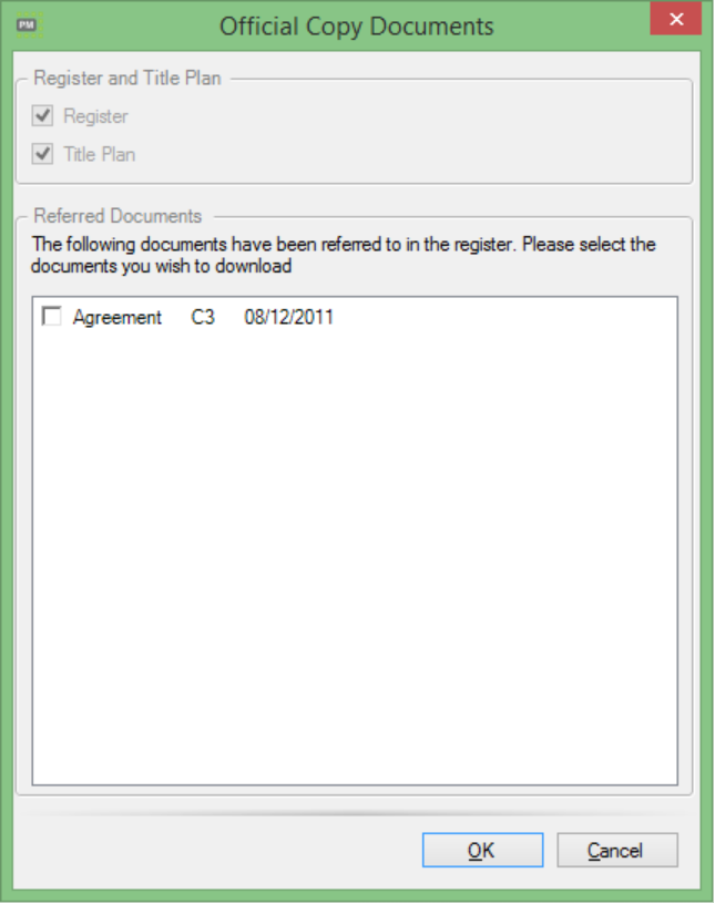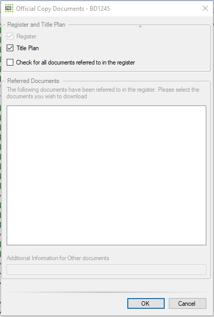 When the service is selected, either from the drop-down Land Registry menu or by ticking a task with this as a triggered action, a window will appear. Untick the Title Plan option if it has already been obtained, and tick if you wish to check for all documents referred to in the register. Click OK to continue.