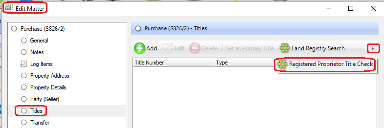 As well as being configurable as a task trigger, or run from the Land Registry button, this can also be fired from the matter on the Property Details panel. Highlight the Title Number added, click the black arrow to the right of the window and then select Registered Proprietor Title Check: