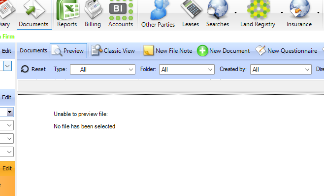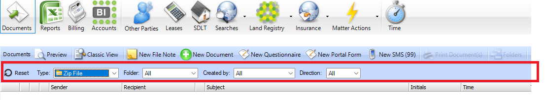 If on another case you were looking for a particular file type, or documents created by a user - Redbrick remembers these options. The new file you've gone into may not have any documents of that file type, or created by that user.