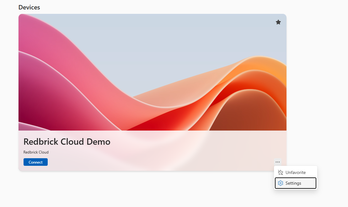From within the windows app you can set your Redbrick Cloud desktop to open in a few ways, but clicking the ... and selecting settings