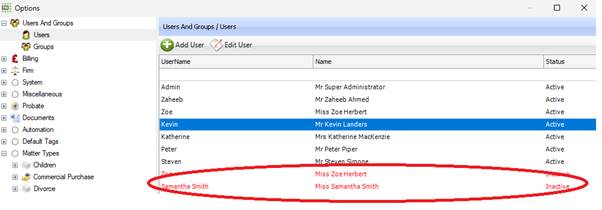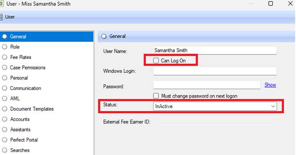 log into the system, and they will not be shown in the Partner or Fee Earner list when creating a case. Their references next to any documents they have created or tasks