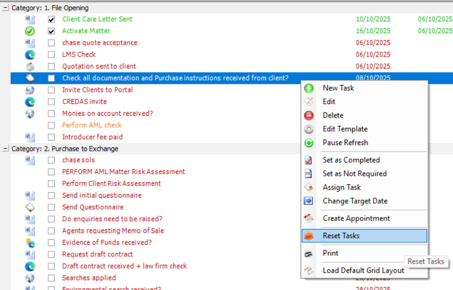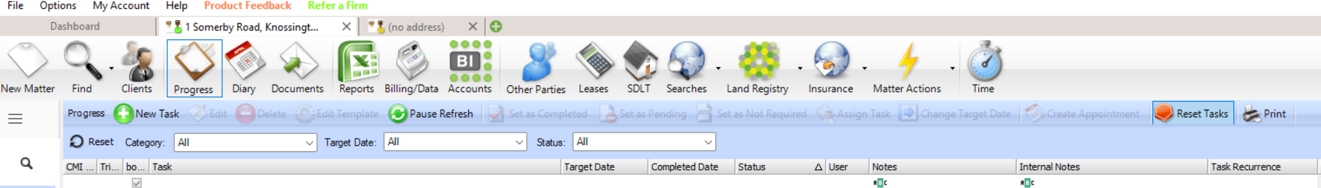However, if any new task templates are created these will not pull into existing matters. Therefore what you need to do is tell the case to repull from the templates and this can be done by clicking on the 'Reset Tasks' button on the far right of the Progress screen (or right clicking on a task and selecting 'Reset Tasks').