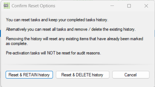 Reset & DELETE history will reset every single task back to their default state. All ticked tasks will therefore be unticked, all notes / internal notes wiped, all completed dates removed, and any tasks crossed out as 'not required' put back to required, etc.