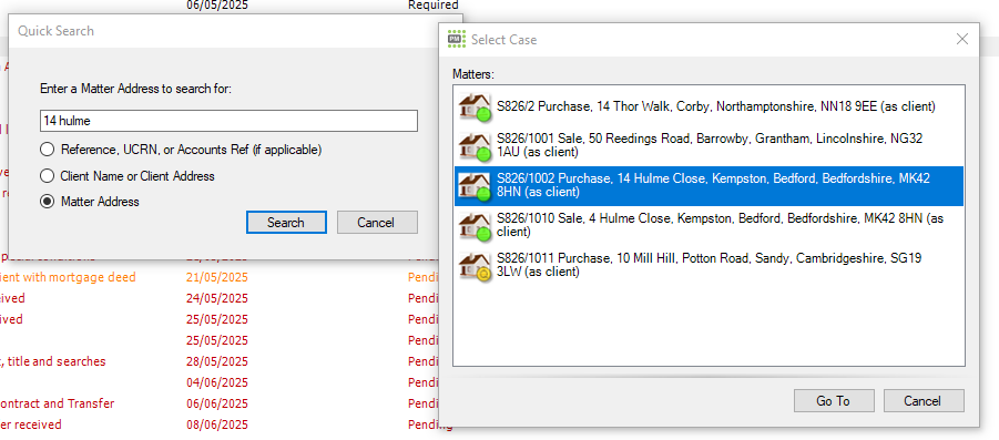 A window will then open giving you 3 options for your search - Reference, UCRN or Accounts Ref (if applicable); Client Name or Client Address; Matter Address. Change the radio button accordingly/if applicable (the system will default to placing the radio button in the same one you selected last time) and then type what you are searching for and click 'Search'. The system will then display any possible matches. Highlight the correct one if there are multiple and click on 'Go To'.