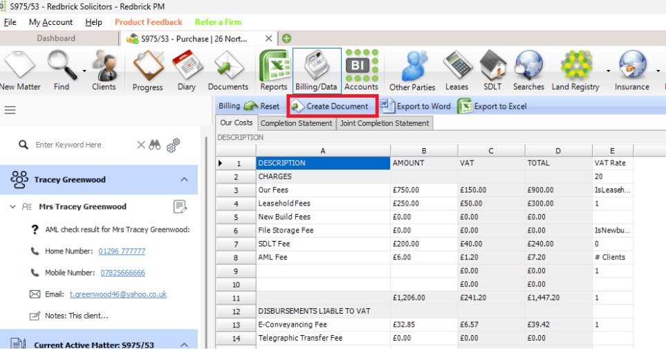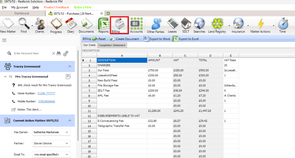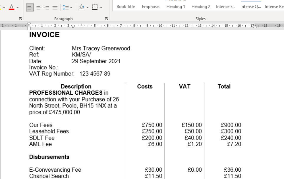 Please note - Billing documents can take longer to open that regular documents and letters because every cell in the billing screen is being checked for a value before being pulled into the document (as previously explained, if the value of a disbursement is '£0.00' it will not appear in the document).
