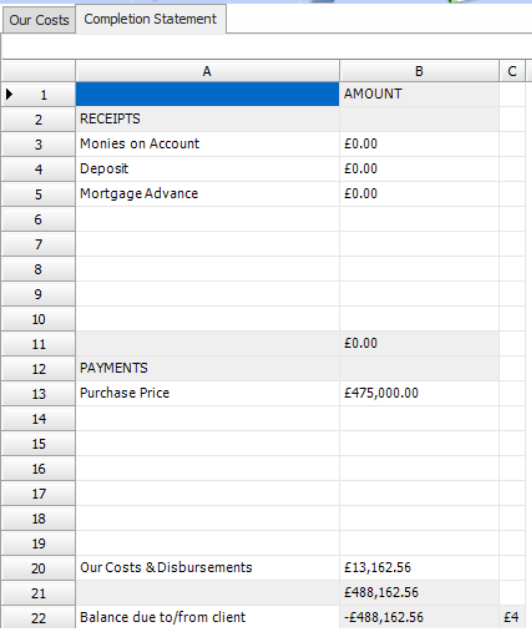 As in the example image above, you will see that the screen has two tabs. One is called Our Costs which is used for quotes and bills/invoices. The other tab is called Completion Statement which is for completion (financial) statements.