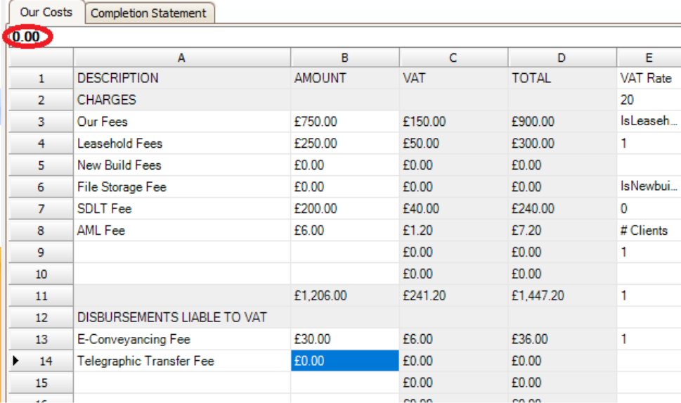 If you need to add or amend a fee or disbursements description or amount, simply click on the cell that you require, and your cursor will appear towards the top of the screen. Just type the information and press Enter to lock it in (this is important as pressing Tab, or simply clicking out of the area, will not save the entry).