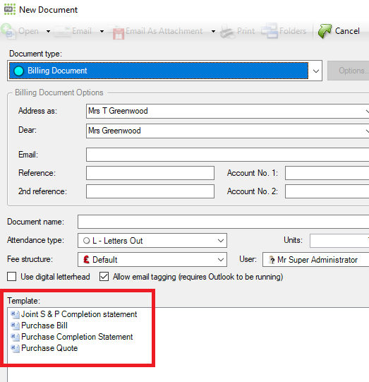 A New Document window will appear (see 'Document User Guide' for more information on this) with the Billing document type already selected. If your billing templates are located elsewhere (e.g. Client / Solicitor) then change the dropdown to the right recipient and search for the template you need to create. From here, all you need to do is double-click on the highlighted document for it to open in Word format.