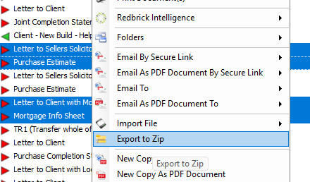 To do this, simply select the documents you wish to Zip (either holding Shift or Ctrl on your keyboard to select multiple) Right Click and select Export to Zip